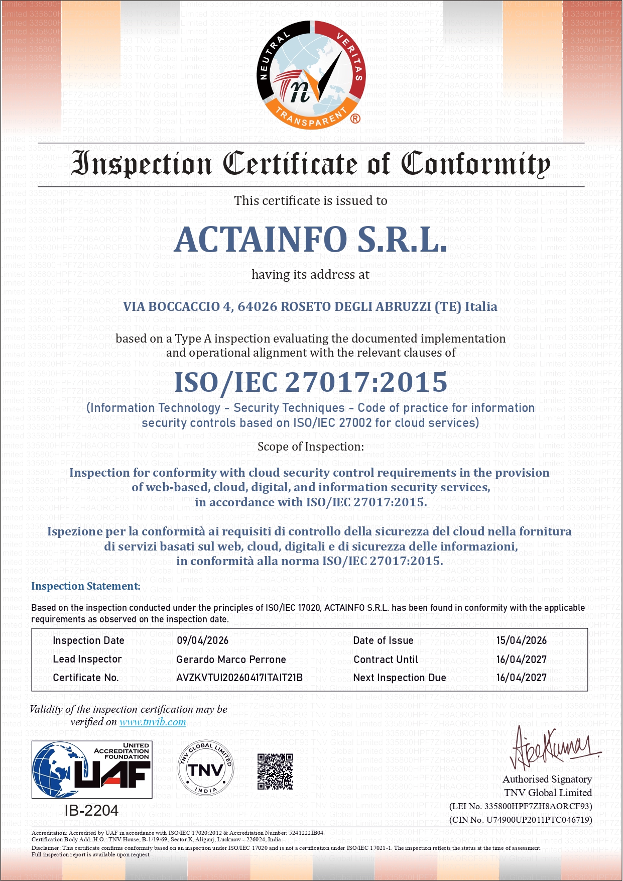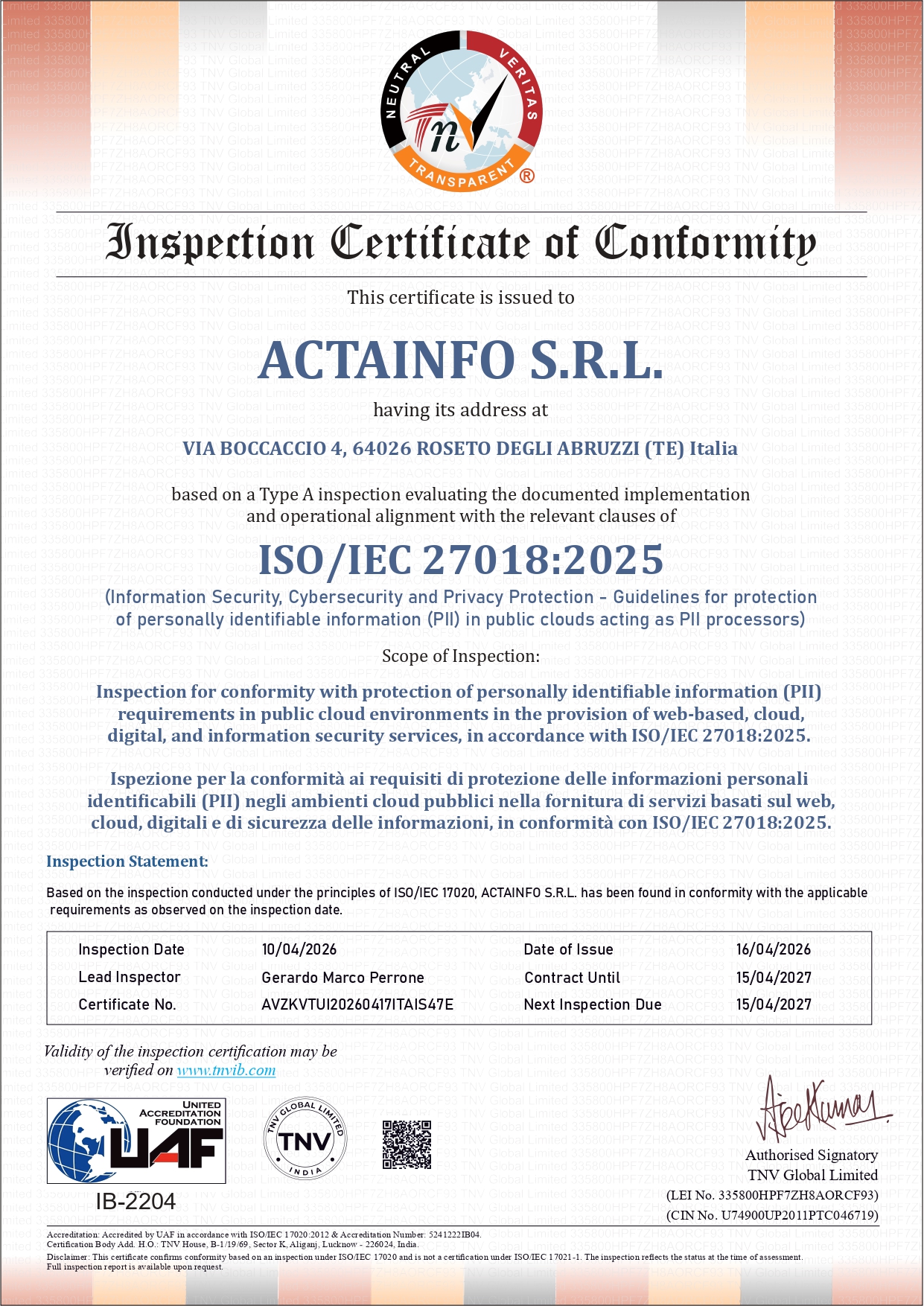 Actainfo è soggetto Aggregatore SPID, intermediario tecnologico di AGID, certificata ISO 9001:2015, ISO/IEC 27001:2022, ISO/IEC 27017:2015, ISO/IEC 27018:2025 e ISO/IEC 27701:2019 per la qualità e la sicurezza delle informazioni nel settore ICT – Servizi informatici, digitali, conservazione documenti, privacy, siti web e applicativi on line.